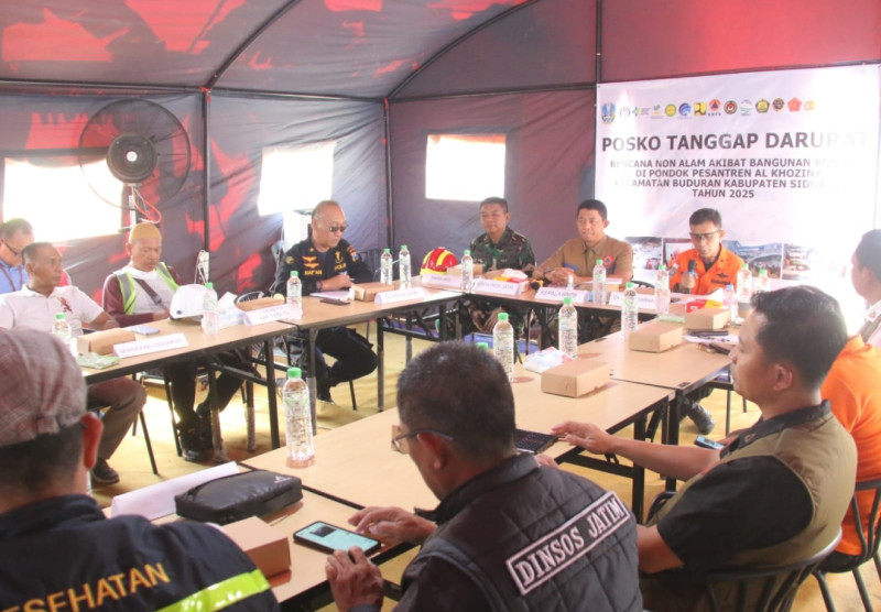 SIDOARJO I Postjatim.com – Hari ini Sabtu 04/10/2025 di Posko Tanggap Darurat, Kepala BNBP Letjend TNI Suhariyanto serta Deputi III Penanganan Darurat BNPB Mayjend TNI Budi Irawan laksamana pertama Bramantyo, Kapolres Sidoarjo, Dandim 0816 Sidoarjo, Asisten Adm Perekonomian Pembangunan Mahmud,  serta beberapa unsur terkait melaksanakan jumpa pers dalam Rapat Koordinasi rutin harian untuk mengevaluasi pada setiap kekurangan dan kelemahan operasi penyelamatan dan evakuasi dan penanganan secara sekeluruhan terjadinya bencana yang menimpa Pondok Pesantren  Al Khoziny di Sidoarjo.